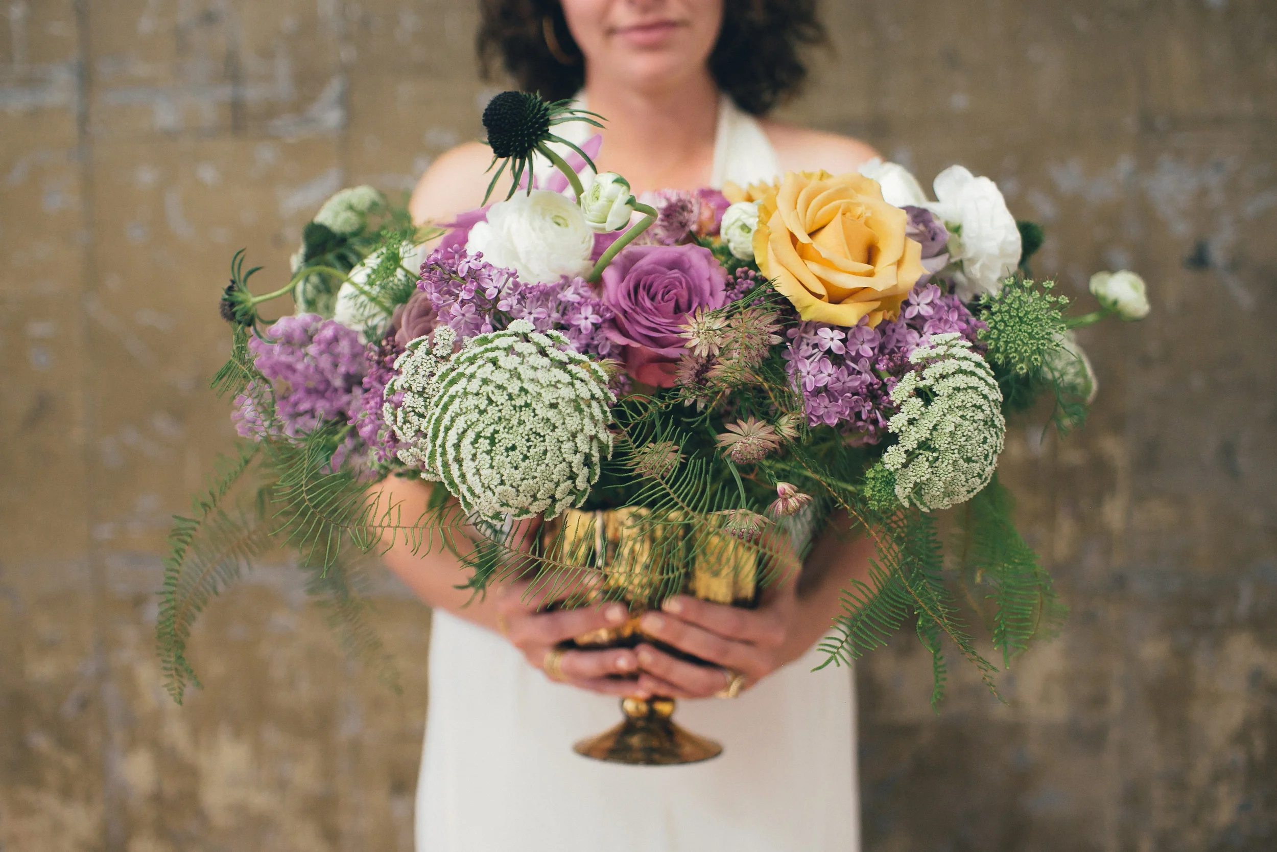 This stunning wedding inspiration was conjured up by the talented, LA-based photographer Stephanie Fishbein. Her artistic stamp is evident in every photo. The first words that come to mind are industrial, romance, and of course...purple.