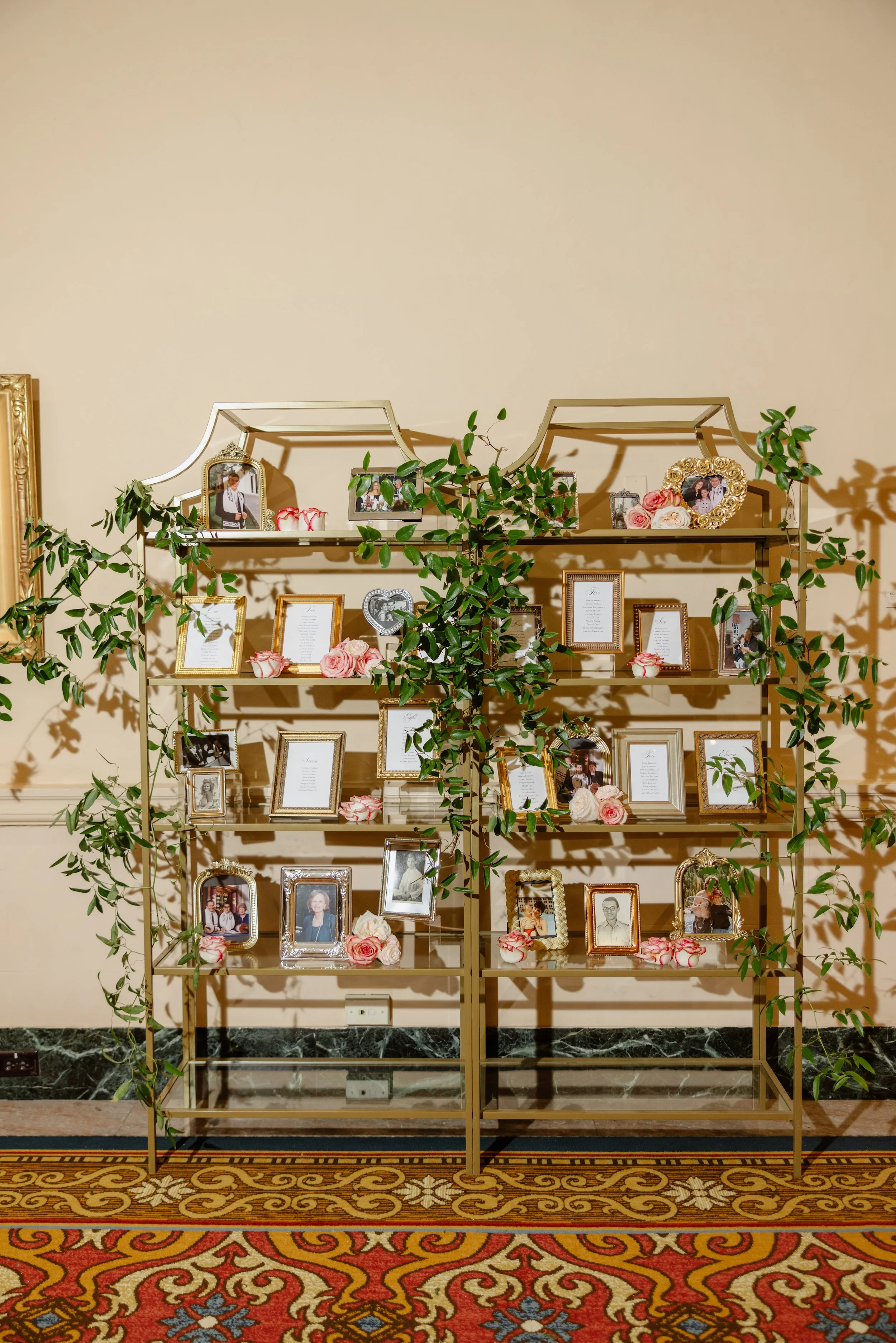 Gorgeous, modern brass gold shelf unit with ornate top. Four large shelves with smaller top shelf.